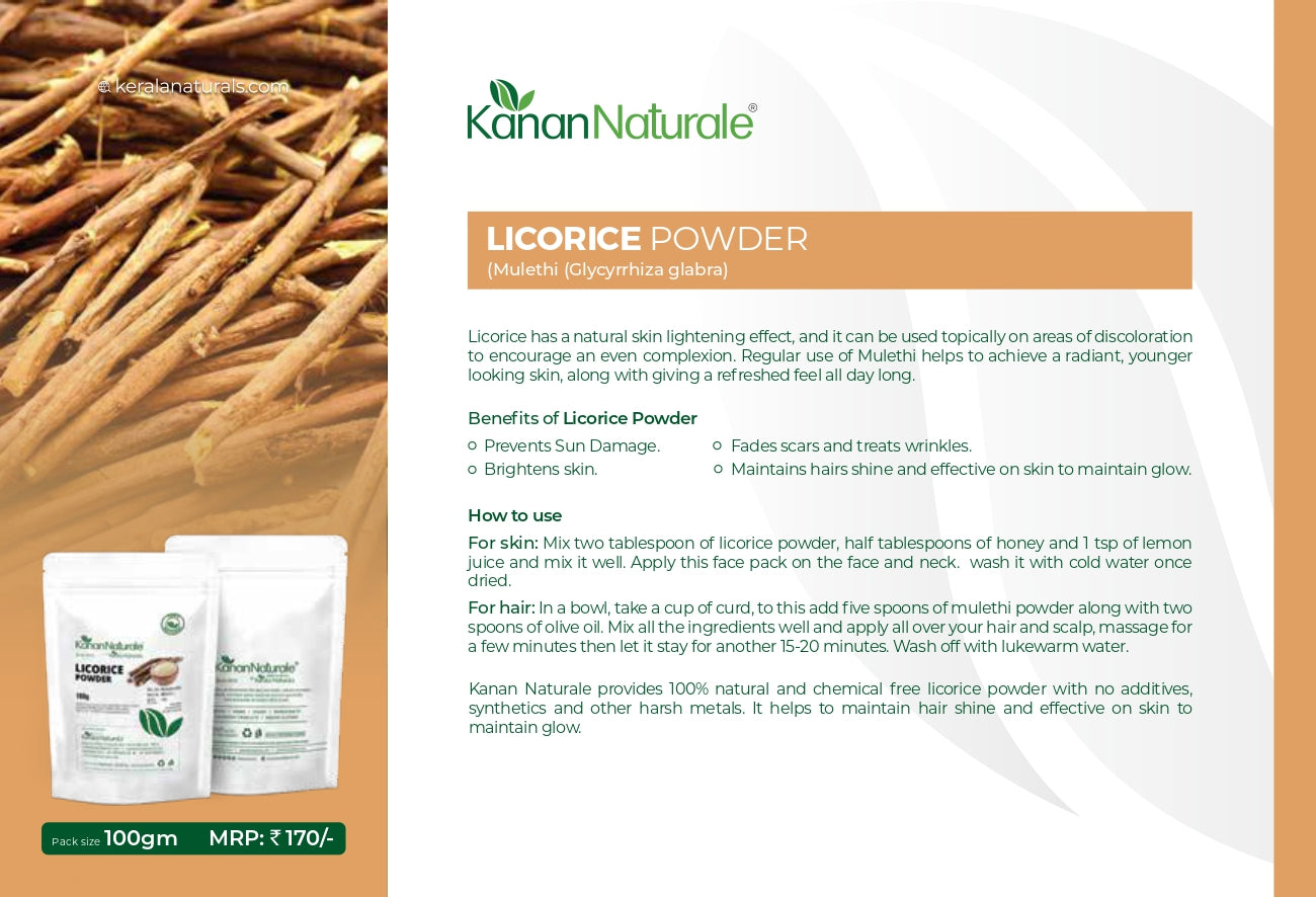 Kerala Naturals Licorice root Powder ( Mulethi ) contains the antioxidant glabridin and licochalcone A. They both have powerful anti-aging and skin-soothing properties. That means licorice root extract can combat hyperpigmentation, those annoying dark marks you get from sunspots, or acne scars that don’t just fade away.